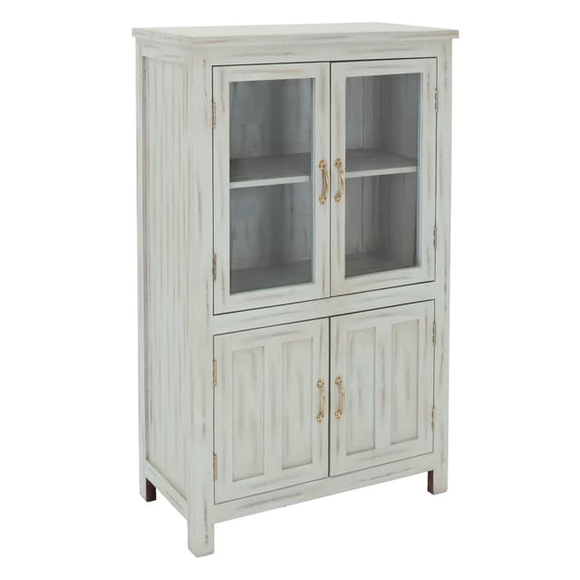 Korostuksia asettavat kultaiset ovenkahvat neljässä ovessa. Kahdessa ylimmässä ovessa on lasilevy, ja säilytystila on erotettu välihyllyllä. Alla oleva säilytystila ei ole näkyvissä ja se on hieman pienempi kuin ylempi. Leveys on 79 cm, joten Shabby Chic -lookin korkealauta on helppo integroida olemassa oleviin elämysmaisemiin.