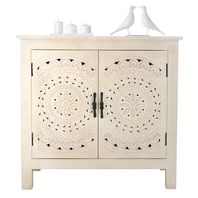 Kuvaus:Jokainen kappale on ainutlaatuinen! Tämä mangopuusta valmistettu lipasto on valmistettu käsityönä. Kahden oven ainutlaatuiset kaiverrukset innostavat ensi silmäyksellä.Tutustu ominaisuuksiin