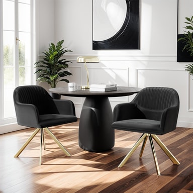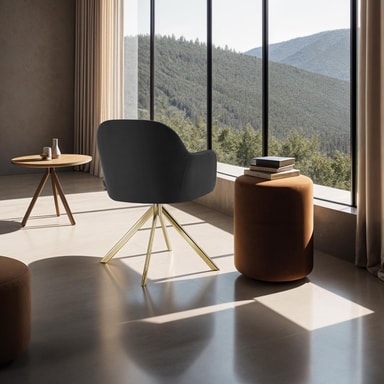 Suuri istuinosa, jossa on yhtenäinen käsinoja ja selkänoja, tarjoaa puhdasta mukavuutta erittäin hienon samettipäällysteen ja tiheän vaahtomuovipehmusteen ansiosta ja kutsuu viipymään. Lisäksi tuolit ovat täysin 360° kääntyviä, mikä mahdollistaa maksimaalisen liikkumisvapauden – täydellinen pitkille illallisille tai rentouttaville hetkille olohuoneessa.