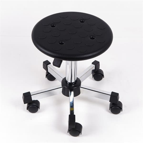 Tekniset tiedot - Pintamateriaali: PU-polyuretaanivaahto - Istuimen pehmuste: halkaisija 330mm - Runko: Korkeuden säätö ylös ja alas - Tuolin jalat: Kylmävalssattu teräs kromipinnoitteella, hitsaamattomat pyörät, halkaisija 550mm - Pyörät: PA-nylonrulla - Säädettävä korkeus: 420~560mm