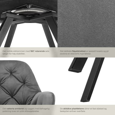 Siisti 180° kääntötoiminto jousimekanismilla täydentää istuinmukavuuden onnistuneesti, sillä se lisää liikkumisvapauttasi ja antaa sinun sitten kevyesti heilauttaa itsesi takaisin lähtöasentoon.