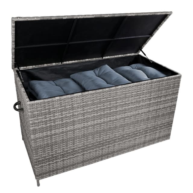 Kohota ulkoilmakehäsi tällä harmaalla rottinkisella puutarhasäilytyslaatikolla, joka on täydellinen puutarhasäilytysratkaisu.