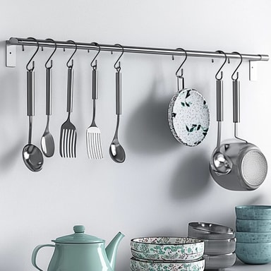 Nämä koukut ovat yksinkertainen, toimiva ja tilaa säästävä ratkaisu keittiön säilytykseen. Ripusta kattilat, pannut, keittiövälineet tai pyyhkeet kätevästi käden ulottuville ja järjestä keittiösi ammattikokin tavoin!
