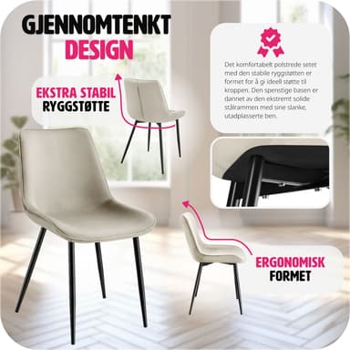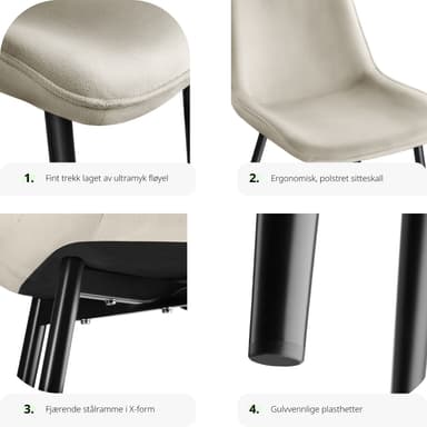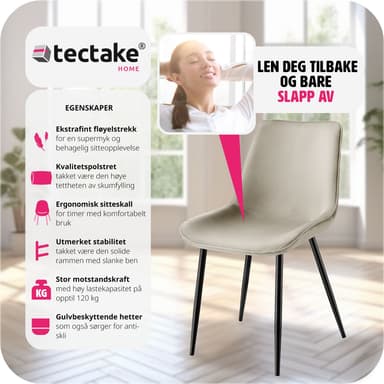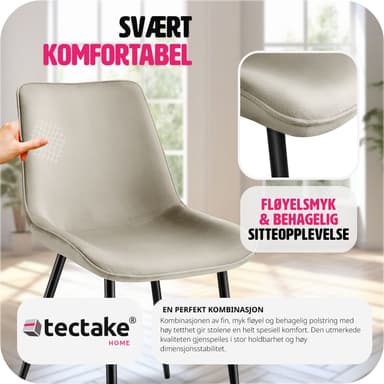 Tyylikkäät sametinäköiset ruokailutuolit Tectakelta tarjoavat vaikuttavan muotoilun, joka sopii mihin tahansa kotiin. Nämä tuolit on ergonomisesti muotoiltu mukavilla istuintyynyillä, jotka tekevät istumisesta erittäin miellyttävää. Niiden ajaton muotoilu varmistaa, että ne sopivat hyvin muihin sisustustyyleihin. Lisäksi tuoleissa on lattiaa suojaavat muoviset korkit, jotka ovat hellävaraisia lattiallesi. Nämä ruokailutuolit ovat erittäin vakaita ja kestäviä, mikä tekee niistä täydellisiä jokapäiväiseen käyttöön. Hanki upeat samettituolit Tectakelta keittiöösi tai olohuoneeseesi jo tänään.