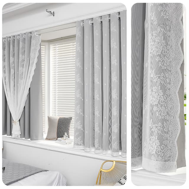 Mörkläggningsgardiner: Gardinerna är gjorda av polyester och spetsmaterial, som har utmärkt skuggningsprestanda, med en skuggningsgrad så hög som 90 %, vilket effektivt kan blockera ljus och skapa en bekvämare inomhusmiljö.