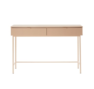 Työpöytä SEQUENCE 120x50xH79cm, cappuccino. Pöytälevy ja runko on valmistettu huonekalulevystä. Laatikon etuosat: koristeellinen uurrettu MDF-paneeli. Pöytä on viimeistelty kestävällä polyuretaanimaalilla. Pöydän jalat ja runko on valmistettu metallista ja pulverimaalattu.