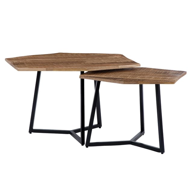 Jokainen pala on ainutlaatuinen! Moderni ja ylellinen taulukko joukko WOMO-DESIGN® on todellinen helmi ja oikea valinta suunnittelussa oleskelutilaa. Yhdistelmä 6-kulma, karkea leikkaus top kiinteässä mango puu ja jauhe-päällystetty metallirunko antaa kodin yksilöllisen ilmeen. Taulukoissa kahta eri kokoa voidaan käyttää yksinään tai voidaan sijoittaa yhteen ja joukko luovan inspiraation.
