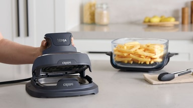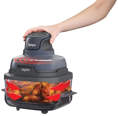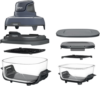 1700 W Ninja Crispi -kiertoilmakypsennin sisältää 2 lasiastiaa (1,4 l ja 3,8 l). Siinä on 4 keittotilaa, mukaanlukien kiertoilmakysnnus, paistaminen, lämmittäminen ja lämpimänäpito.Tutustu ominaisuuksiin