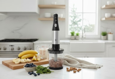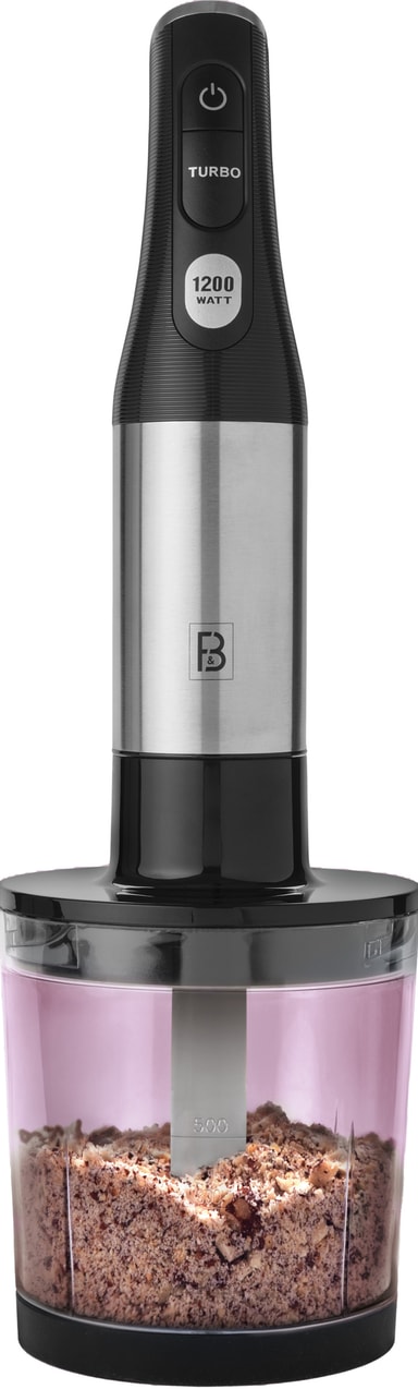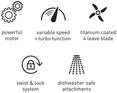 F&B-sauvasekoitin tarjoaa 6 nopeutta, turbotoiminnon ja titaaniterän, joka sopii kuumille ja kylmille aineksille. Pakettiin kuuluu 500 ml silppurikulho, 600 ml sekoitusastia ja ruostumaton vispilä. Kaikki osat ovat konepesun kestäviä.Tutustu ominaisuuksiin