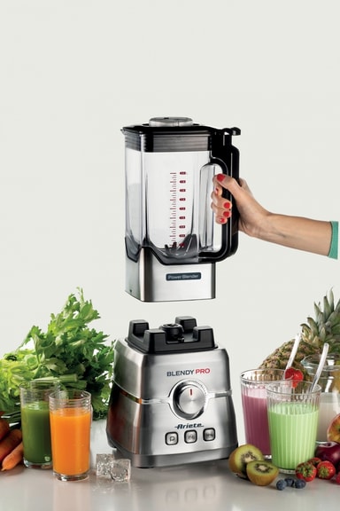 3 funktioner: pulserande, iskrossare och mixer. Ideal för att förbereda perfekta milkshakes, smoothies, såser och cocktails på några sekunder. 2000W och 32000 t/min för snabba recept och intensiva smaker tack vare de 6 blad som är gjorda av mycket beständigt rostfritt stål. 2L BPA-fri tritanskål med hölje av rostfritt stål och lock med öppning och pressare för att tillsätta ingredienser.