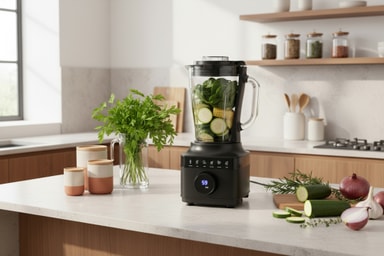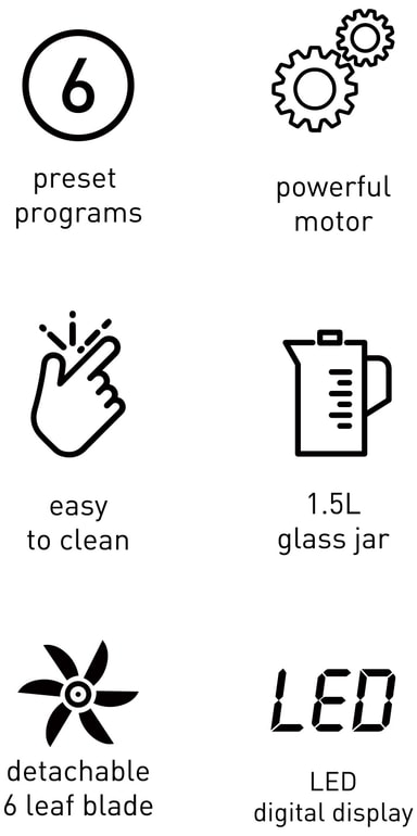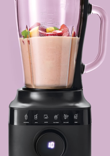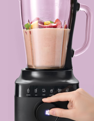 Tehosekoitin tarjoaa 6 monipuolista toimintoa, joita ohjataan intuitiivisella kosketusnäytöllä, mikä mahdollistaa helpon siirtymisen eri tehtävien, kuten sekoittamisen, soseuttamisen ja jään murskaamisen välillä.