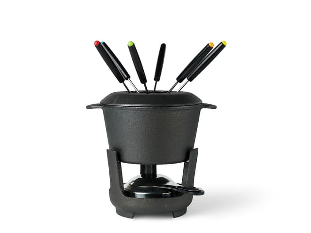10 piece fondue set made of black cast iron. Black inside and outside diameter 15 cm including burner, pan, holder and 6 forks made of black plastic with colour indicators. Not dishwasher friendly. Before putting cast iron away, make sure it is compl