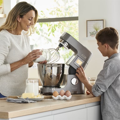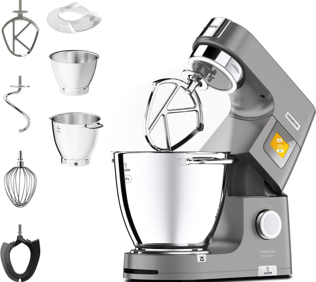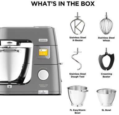 Kenwood Chef XL Titanium Patissier -yleiskone on varustettu 7-litraisella EasyWarm-kulholla, 5-litraisella lisäkulholla, BakeAssist-kosketusnäytöllä sekä lukuisilla esiasetetuilla SimpleTouch-ohjelmilla.Tutustu ominaisuuksiin