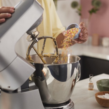 Yleiskoneen mukana saat useita ruostumattomia teräksisiä kulhotyökaluja, K-vatkain, vispilä, taikinakoukku ja kermavatkain täydellisen sileitä kuorrutteita ja kakkuseoksia varten. Lisätarvikkeet voi pestä tiskikoneessa.