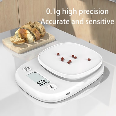 Högprecisionssensor: Utrustad med ett högprecisionssensorsystem säkerställer denna köksvåg noggranna mätningar från 0,1 g till 3 kg. Perfekt för bakning, matlagning och portionskontroll, vilket ger konsekventa och pålitliga resultat varje gång. Oavsett om du mäter kryddor, vätskor eller fasta ämnen kan du lita på att denna våg levererar exakta avläsningar, vilket hjälper dig att uppnå kulinarisk perfektion. Dess noggrannhet gör den till ett oumbärligt verktyg för både amatörkockar och professionella kockar.