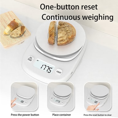 Tareringsfunktion: Tareringsfunktionen gör att du enkelt kan mäta ingredienser i en behållare utan att inkludera behållarens vikt. Placera helt enkelt behållaren på vågen, tryck på tareringsknappen för att återställa displayen till noll och tillsätt sedan dina ingredienser. Den här funktionen förenklar mätningsprocessen och minskar antalet diskar du behöver använda. Det är särskilt användbart när du följer recept som kräver att flera ingredienser tillsätts i samma skål.