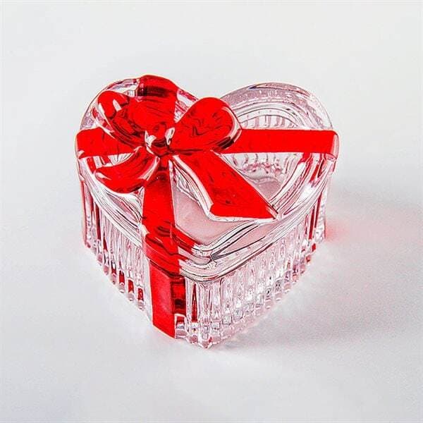 Kaunis sydämen muotoinen lasikulho, jossa on kansi ja koristeellinen rusetti
