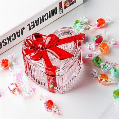 Tämä viehättävä sydämenmuotoinen lasikulho kannella on ihana yksityiskohta kaikille, jotka arvostavat tyylikästä säilytystä. Kulho on koristeltu koristeellisella punaisella rusetilla, joka antaa sille lahjatunnelman ja tekee siitä täydellisen lahjan erityisiin tilaisuuksiin. Se on kooltaan 9 x 7,5 x 6,5 cm ja painaa 360 grammaa. Se on sekä käytännöllinen että koristeellinen ja sopii pienten esineiden, makeisten tai korujen säilytykseen.