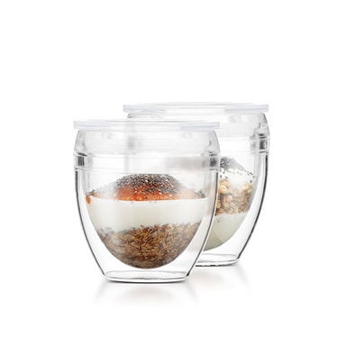 Tämä innovatiivinen välipalamuki tarjoaa lasin kauneuden ja kirkkauden ilman sen haurautta. Ne on valmistettu kestävästä, BPA-vapaasta muovista, joten ne ovat ja turvallisia käyttää koko perheelle. Niiden kaksoisseinärakenne pitää kuumat ja kylmät ruoat ja juomat optimaalisessa lämpötilassa pidempään, ja kansi varmistaa sisällön pysymisen turvassa liikkuessa - varmista itse vain, että ne pysyvät pystyssä turvallisuuden vuoksi.