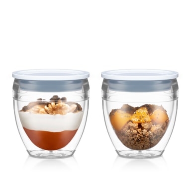 Tämä innovatiivinen välipalamuki tarjoaa lasin kauneuden ja kirkkauden ilman sen haurautta. Ne on valmistettu kestävästä, BPA-vapaasta muovista, joten ne ovat ja turvallisia käyttää koko perheelle. Niiden kaksoisseinärakenne pitää kuumat ja kylmät ruoat ja juomat optimaalisessa lämpötilassa pidempään, ja kansi varmistaa sisällön pysymisen turvassa liikkuessa - varmista itse vain, että ne pysyvät pystyssä turvallisuuden vuoksi.