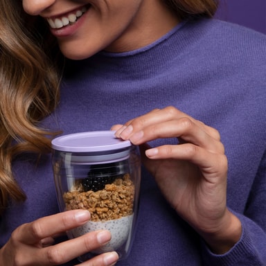 Aina liikkeellä? Pysy nesteytettynä ja ravittuina missä tahansa liikutkin kannella varustettujen PAVINA to-go -kuppien avulla. Tämä uudelleenkäytettävä matkakuppi on ihanteellinen vasta valmistetun smoothien, jogurtin, granolan, hedelmien tai kuuman tai kylmän juoman kuljettamiseen, olitpa sitten toimistossa, koulussa, matkoilla, tai vain nauttimassa rentouttavasta iltapäivästä puistossa.