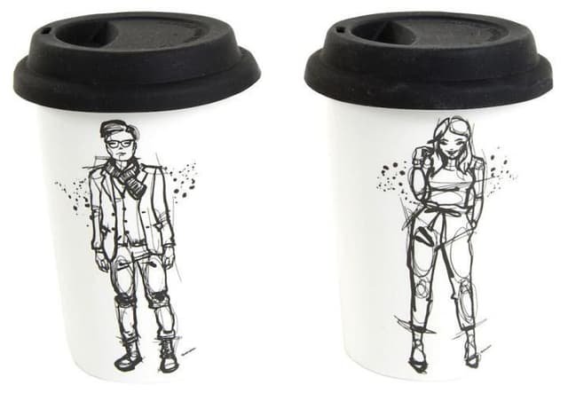 2-pack posliinimukeja silikonikansilla, toisessa mukissa on Sara Woodrow'n piirtämä painatus His ja toisessa Her.