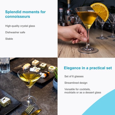 Voit tehdä vaikutuksen vieraisiisi tällä käytännöllisellä juhlavälineellä. Se on täydellinen lisä mihin tahansa baariin, olipa kyseessä sitten liike- tai vapaa-ajankäyttö. Se ei sovellu vain cocktaileihin, vaan myös viiniin, aperitiiveihin yms. Kristallinkirkkaan lasin laadukas muotoilu näyttää tyylikkäältä ja tyylikkäältä missä tahansa ympäristössä. Cocktaillasit toimitetaan 6 kappaleen pakkauksessa ja ne ovat konepesun kestäviä. Ihanteellinen