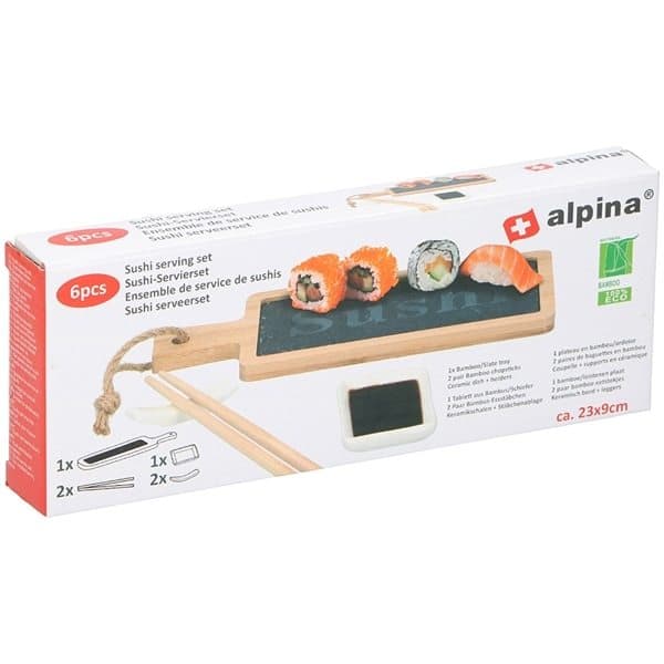 Tyylikäs tarjoilusetti sushille, joka koostuu bambusta valmistetusta tarjoilualustasta, jossa on upotettu liuskekivilevy, kaksi lisätarvikekulhoa esim. soijalle ja syömäpuikot niille kuuluvalla puikkoalustalla.