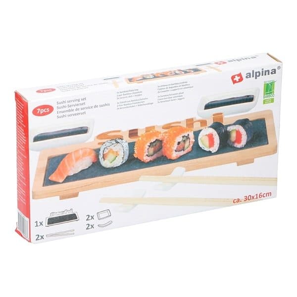 Tyylikäs tarjoilusetti sushille, joka koostuu bambusta valmistetusta tarjoilualustasta, jossa on upotettu liuskekivilevy, kaksi lisätarvikekulhoa esim. soijalle, sekä syömäpuikot niille kuuluvalla puikkoalustalla.