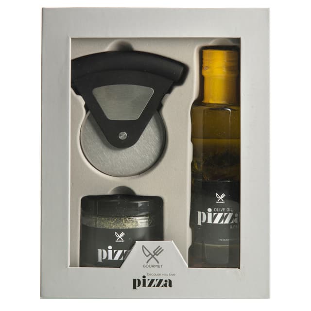 Cemo Gourmet CEMO6701 tuotepakkaus sopii erinomaisesti lahjaksi. Pakkaus sisältää ruostumattomasta teräksestä valmistetun pizzahyrrän, maustesekoituksen ja oliiviöljyä.