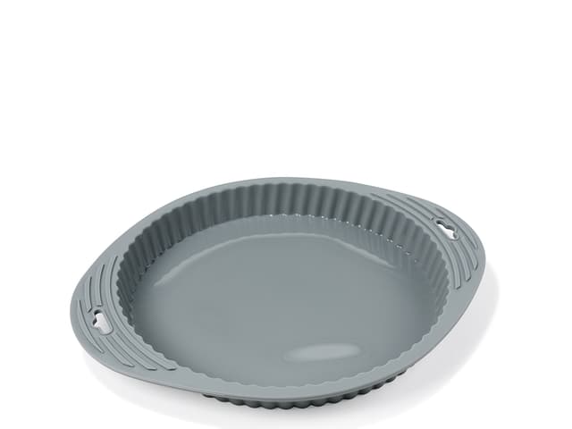 Flan mould 26 cm. 33 x 25.5 x 3 cm. Made of grey silicone. Oven, microwave, freezer and dishwasher safe. Withstands up to 220 degrees and down to -20 degrees.Tutustu ominaisuuksiin