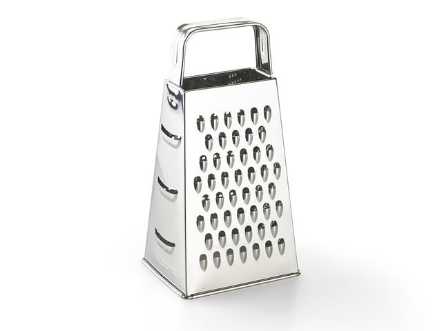 Classic grater with 4 sides. Stainless steel. The four sides make it possible to grate the food both finely and into ribbons. The grater can be used for both hard and soft foods and can therefore be used for anything from carrots and ginger to soft