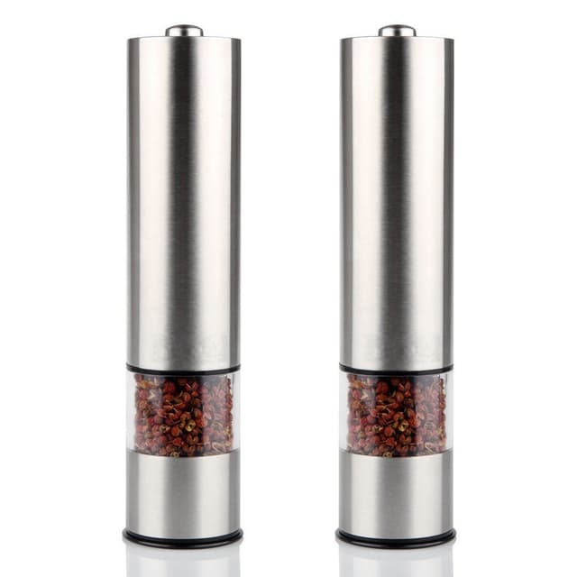 2 tyylikkään suola- ja pippurimyllyn sarja. Valmistettu ruostumattomasta teräksestä ja siinä on läpinäkyvä osa, joka näyttää sisällön. Saat juuri jauhettua maustetta napin painalluksella sähköisellä pippurimyllyllä!