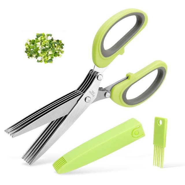 Yrttisakset tukevalla rakenteella, 5 terävällä lehdellä ja liukumattomalla kahvalla, tämä saksi silppuaa ja leikkaa yrttejä ja vihanneksia helposti. Mukana tulee pieni harja, joka poistaa jäännökset muutamalla pyyhkäisyllä.