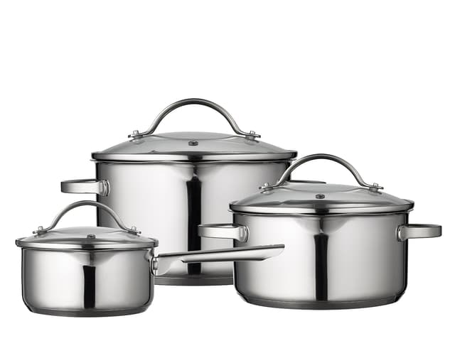 6 part cookware set with lidsMade of polished 18/8 stainless steel with inner satin polishing and measuring scale. The glass lid with a strainer function on two sides ensures that water can be poured from the pan without the content coming with i