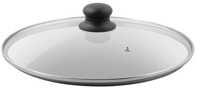 Det 4 mm tjocka glaslocket har en ångventil och ett handtag i bakelit. Den passar 28 cm stekpannor.
