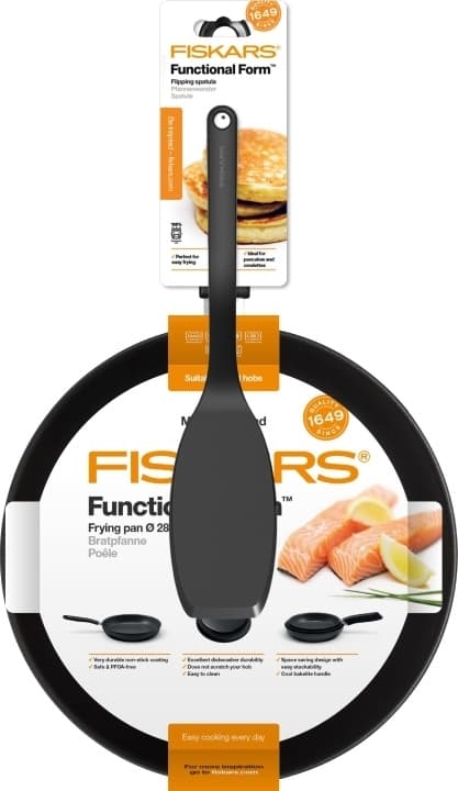 Functional Form-setissä on sarjan 28 cm paistinpannu sekä paistinlasta. Fiskars Functional Form paistinpannu on suunniteltu vaivattomaan arjen ruuanlaittoon. Alumiinista valmistettu pannu lämpenee nopeasti ja tehokkaasti kaikilla liesityypeillä. Pannun kestävä kaksikerroksinen PTFE Hardtec-pinnoite on tarttumaton ja PFOA-vapaa. Ulkopinnoite ei naarmuta liettäsi. Kuumentumaton bakeliittikahva takaa turvallisen ja pitävän otteen pannusta. Functional Form keitto- ja paistoastiat ovat helposti pinottavia, joten ne eivät vie paljoa tilaa ja säilyttäminen on helppoa. Kaiken lisäksi, pannut kestävät erinomaisesti konepesua ja niiden uuninkestävyys on 150° C.