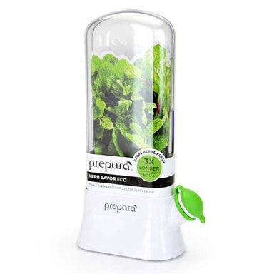 Prepara Herb Savor Eco yrittisäilytys säilyttää yrtit tuoreina jopa 3 viikkoa!On vakaa vesikaivo pitämään juuret ja varret upotettuna veteen ja kristallinkirkas yrtti ""kasvihuone"".Mitat (PxLxK) 7,31 x 15,24 x 27,30 cm