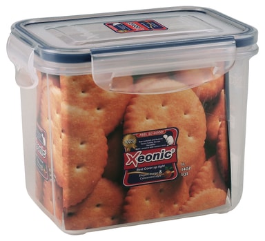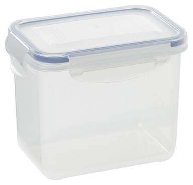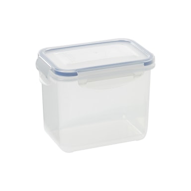 Storage box, rectangular with lid 1 litre. Function. Dimensions: 104 x 147 x 117 mm. Airtight storage box with 4 clips and rubber edging. Microwave safe. Always open the lid when using in a microwave. Frost resistant. Dishwasher safe