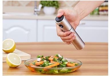 Useita käyttökohteita: Öljysumutin ei toimi vain oliiviöljyn tai auringonkukkaöljyn kanssa, vaan sitä voidaan käyttää yhtä hyvin etikan, soijakastikkeen, sitruuna- ja limetin mehun, marsalaan jne. Ruiskuttamalla nestettä saadaan paljon parempi tulos jopa paistaessa , paistaminen tai paistaminen ja on myös hygieenisempi kuin siveltimen käyttö. Pullo on myös helppo viedä ulos grillaamaan tai piknikille.