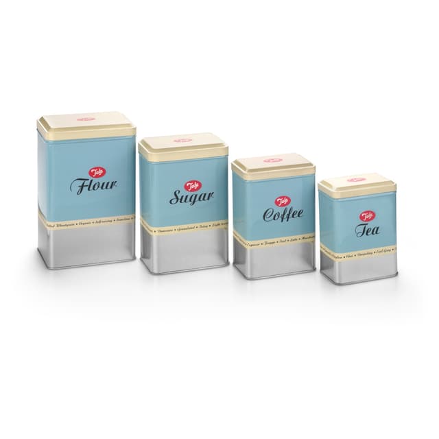 Sarja 4 säilytyspurkkia keittiön tärkeimmille tarvikkeille Jauhot, sokeri, kahvi, teeTutustu ominaisuuksiin