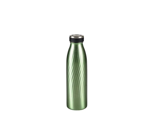 500 ml stainless steel vacuum flask and lid in black soft touch silicone. Green metal finish.The bottle is suitable for both cold and hot drinks, and can be pre-cooled/pre-heated with cold or hot tap water before filling it with the desired beverag
