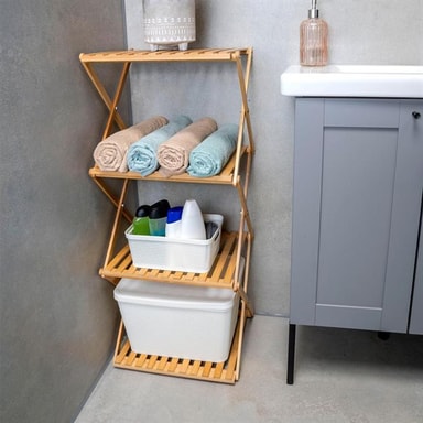 Alpina-bambuhylly tuo luonnollisen ja käytännöllisen lisän kylpyhuoneeseesi. Hyllyn neljä tasoa tarjoavat runsaasti tilaa pyyhkeille, kylpytarvikkeille ja muille tarvikkeille, ja sen taitettava ominaisuus tekee siitä helpon säilyttää, kun sitä ei käytetä.