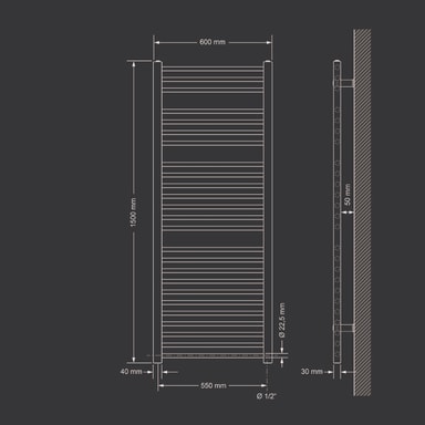 Kylpyhuonepatteri sähköinen lämmityselementillä 1200W 600x1500 mm valkoinen, suora sivuliitäntäTutustu ominaisuuksiin