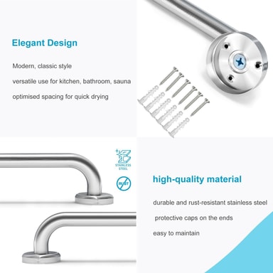 Ruostumattomasta teräksestä valmistettua pyyhekuivainta voidaan käyttää koko talossa sen klassisen suunnittelun ansiosta. Laajasta valikoimastamme löydät sopivan kokoisen pyyhetelineen kaikkiin käyttökohteisiin. Sileän pinnan ansiosta pyyhkeenpidike on hygieeninen ja pysyy bakteerittomana, koska saostumia ei voi muodostua. Mitat: Tangon halkaisija 19 mm. Pituus 30cm. Pituus mitataan tangon keulasta keulanpäähän, joten kiinnitys molemmilla puolilla menee hieman yli määritellyn mitan.