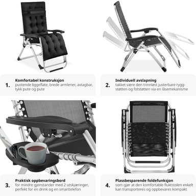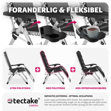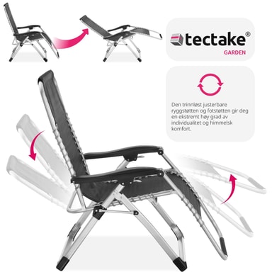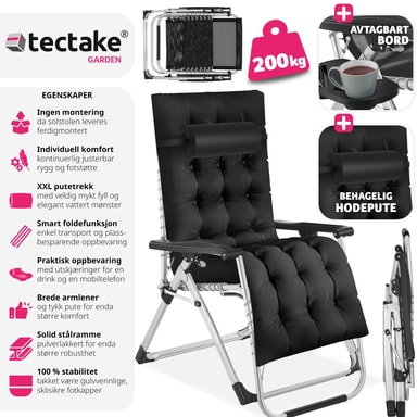 Taitettavalla aurinkotuolilla Cloud tectake:lta makaa kirjaimellisesti kuin pilvillä. Tuolin päätyyny ja paksu, ultrapehmeä pehmuste ovat irrotettavissa, joten voit halutessasi rentoutua myös suoraan hengittävällä Textilene-verhoilulla. Ehdottoman yksilöllisen mukavuuden takaa selkänojan ja jalkatuen portaaton säädettävyys istuvasta täysin kuormitusta vähentävään Zero-Gravity-asentoon. Käytännöllinen sivupöytä juoma- ja älypuhelinaukolla viimeistelee designin täydellisesti – nauti syvärentouttavasta kesästä kestävällä puutarhatuolilla Cloud tectake:lta.