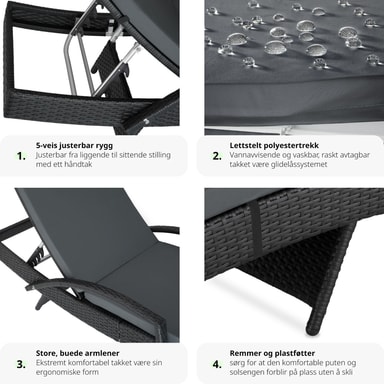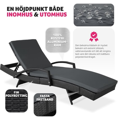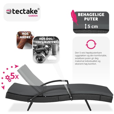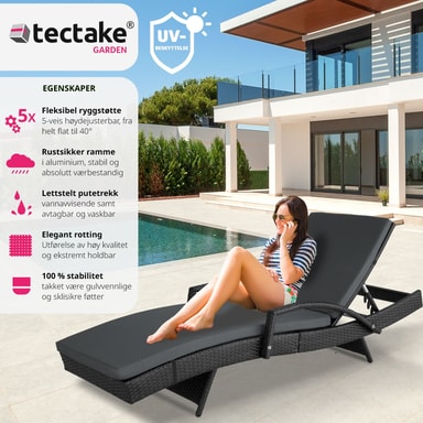 Tällä tectaken toiminnallisella rottinkiaurinkotuolilla olet hyvin valmistautunut lämpimiin kuukausiin. Tyylikäs ja moderni rakenne erottuu edukseen houkuttelevalla muotoilullaan ja poikkeuksellisella mukavuudellaan. Viiden säädettävän selkänojan asennon, pehmeän pehmusteen ja käytännöllisten käsinojien ansiosta löydät ihanteellisen asennon maksimaalista rentoutumista varten. Kestävä polyrottinkikudos ja vankka alumiinirunko tekevät tästä kevyestä ja ruostumattomasta sarjasta täydelliset ulkokalusteet. Tämä tectaken pehmeä aurinkotuoli säätyy täydellisesti juuri sinulle sopivaksi. Ihana lisä mihin tahansa puutarhaan kesällä.