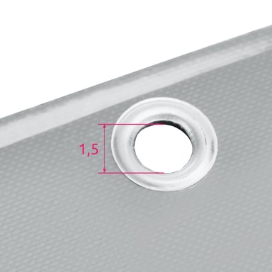 Tekniset tiedot • Kokonaismitat (LxS): n. 200 x 300 cm • Silmukoiden lukumäärä: 20 • Silmukoiden sisähalkaisija: n. 1,5 cm • Silmukoiden ulkohalkaisija: n. 2,7 cm • Silmukoiden välinen etäisyys: n. 47 - 50 cm • Paino: 550 g/m² • Lämpötilan kesto: -30° - +70° • Paino: n. 3,8 kg • Materiaali: polykloridi, polyesteri, alumiini . Toimitus • Tarpeinen kansi