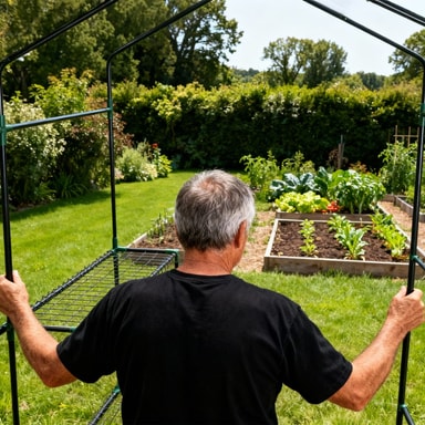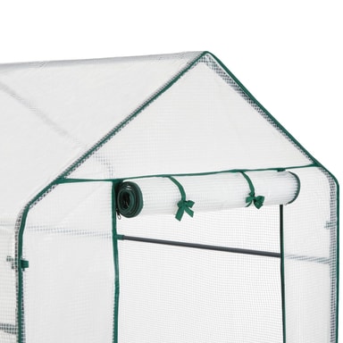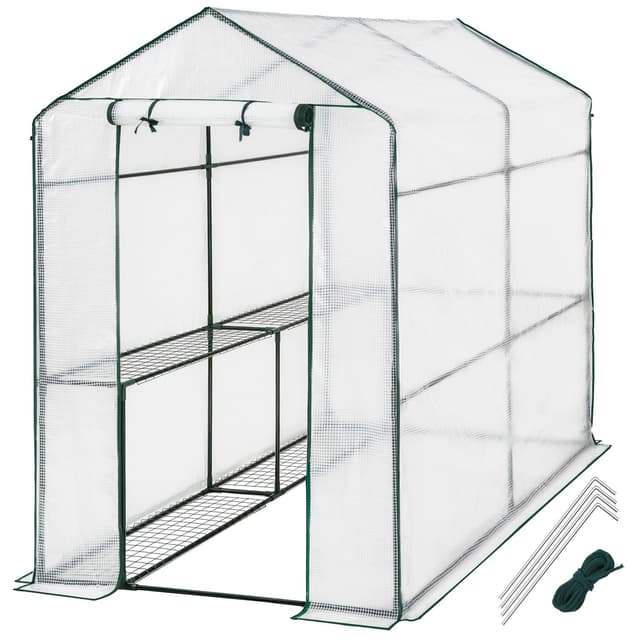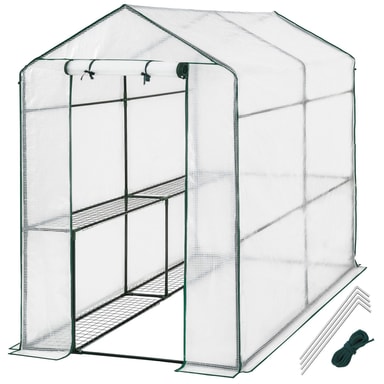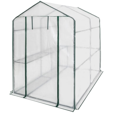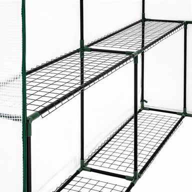 Kohokohdat • Massiivinen teräsrunkorakenne • Riittävä korkeus monille hedelmä- ja vihannestyypeille • Lisätilaa viljelyhyllyn ansiosta, jossa on 4 metallilankahyllyä • Suojaa kasveja kylmältä, sateelta ja pakkaselta • UUV-suoja UV-kestävän PE-verkkokalvon ansiosta • Sisäänkäynti: 60x157 cm voidaan rullata kokoon ja sulkea. • Lisästabiliteetti 4 tapin ja kiristysköyden ansiosta • Färg: valkoinen