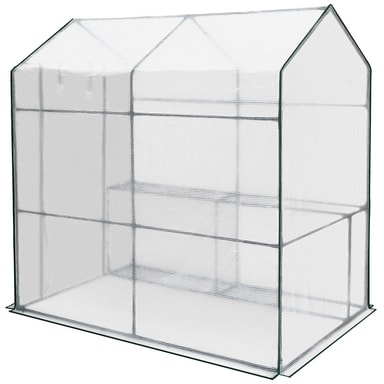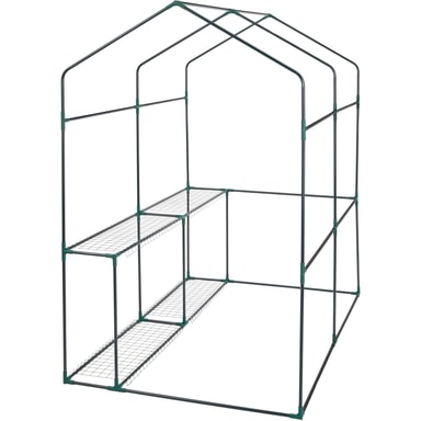 Tekniset tiedot • Kokonaismitat (LxSxK): 186 x 120 x 190 cm • Räystäskorkeus: 150 cm • Lattiapinta-ala: n. 2,2 m² • Tilavuus: n. 3,6 m³ • Korotustelineen leveys: 30 cm korkeudella 2 / 67 cm • Vetoketjulla varustettu sisäänkäynti (LxK): 60 x 157 cm • Teräsrunko: Ø 16 mm • Paino: 8,9 kg • Kalvo: Läpinäkyvä/valkoinen • Materiaali: Jauhemaalattu teräsrunko, muoviset liittimet, polyeteeni 135g/m² UV-stabiloitu verkkokalvo